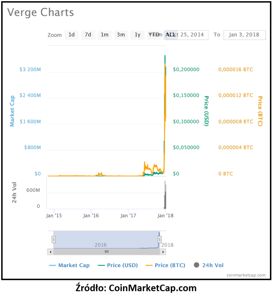 ZWRÓĆ UWAGĘ: Verge stało się prawdziwym przebojem inwestycyjnym z końca 2017 r. Nawet po uwzględnieniu późniejszej korekty cenowej, kurs XVG przez około miesiąc wzrósł ponad dwudziestokrotnie.