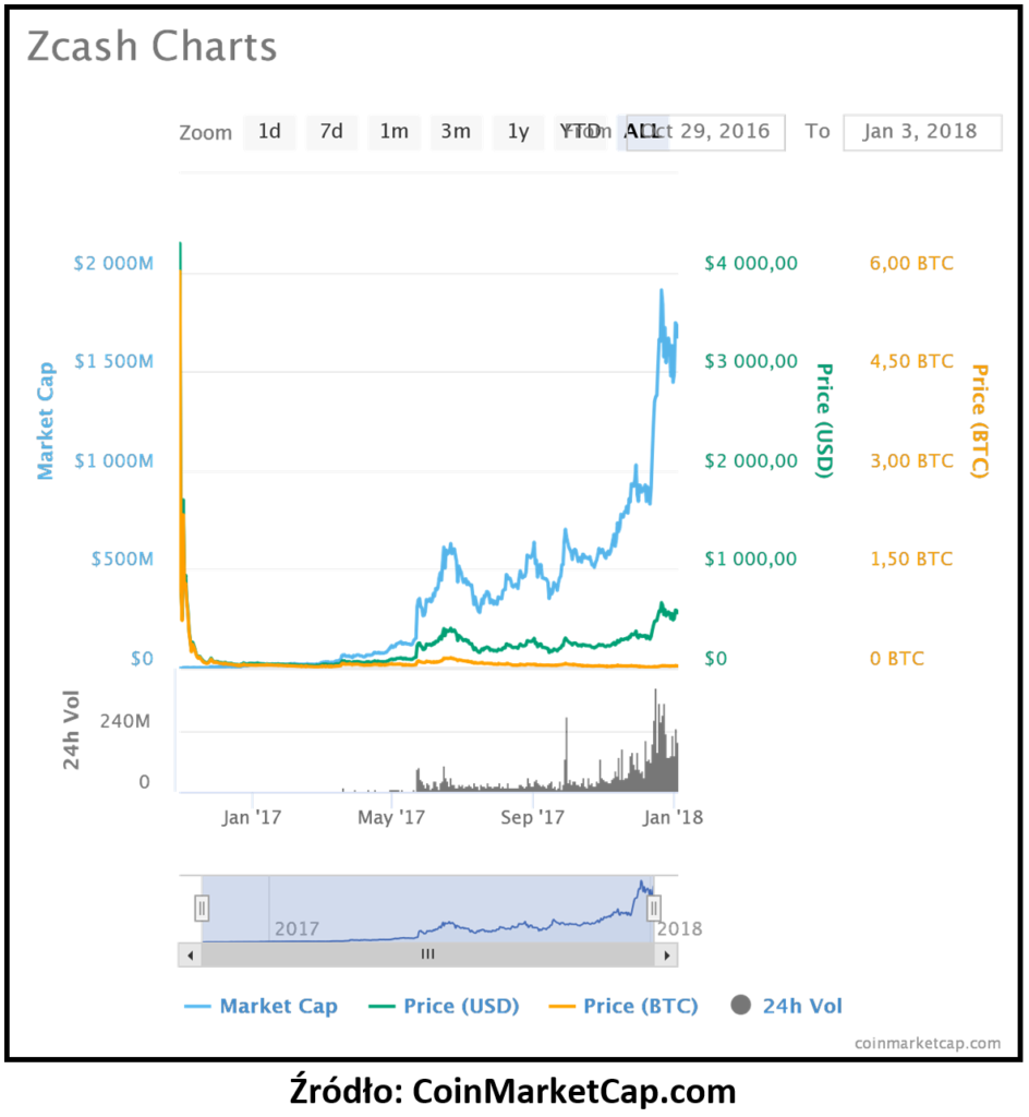 ZWRÓĆ UWAGĘ: Kryptowaluta zcash na początku 2018 r. posiadała nieco wyższą jednostkową wartość niż monero (porównaj wykresy dla ZEC i XMR). Notowania zcash dosłownie eksplodowały w drugiej połowie 2017 r.