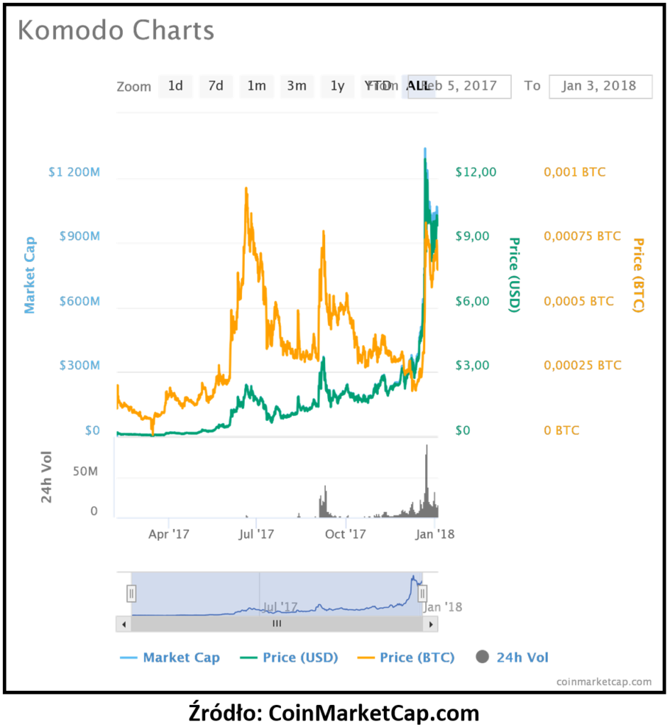 Dzięki zabezpieczeniom z kryptowaluty zcash, dodatkowym zabezpieczeniu łańcuchem bloków bitcoina oraz innym ciekawym rozwiązaniom (dotyczącym m.in. emisji tokenów), komodo wzbudza coraz większe zainteresowanie inwestorów. Skutki tej zmiany dotyczącej KMD, można zauważyć na poniższym wykresie, który pokazuje wzrost wartości obrotów opisywanej kryptowaluty. Jak widać, cena komodo także mocno wzrosła na przełomie 2017 r. i 2018 r. Pod koniec listopada 2017 roku wspomniana kryptowaluta kosztowała jedynie 2,3 dolara. Później jej kurs wzrósł do 13 dolarów (21 grudzień 2017 r.) i ustabilizował się na poziomie zbliżonym do 10 dolarów.