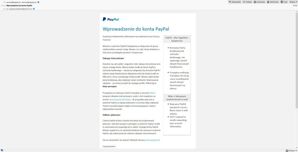 Warto nadmienić, że po założeniu konta PayPal, otrzymamy specjalny e-mail rejestracyjny (zobacz poniższa grafika). W tej powitalnej wiadomości, będzie wymienione imię oraz nazwisko klienta podane podczas rejestracji.