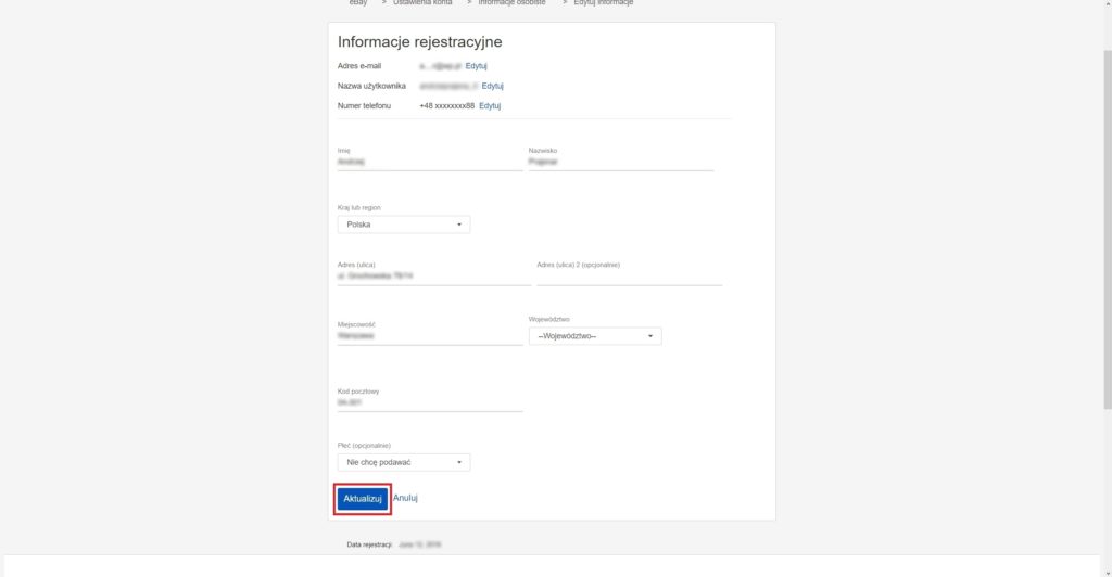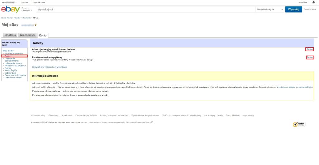 W ramach kontynuacji naszego przykładu, teraz powrócimy do głównego panelu eBay.pl i zakładki „Konto” (patrz poniższa grafika). W tym miejscu, po lewej stronie można zobaczyć opcję „Adresy”. Po kliknięciu na napis „Adresy” w pasku umieszczonym po lewej stronie ekranu, naszym oczom ukażą się dwie opcje: „Adres rejestracyjny, e-mail i numer telefonu” oraz „Podstawowy adres wysyłkowy”. Najpierw uzupełnimy podstawowe dane poprzez kliknięcie przycisku „Zmień” widocznego po prawej stronie ekranu (zobacz poniższa grafika). Trzeba przyznać, że umiejscowienie wspomnianego przycisku/napisu jest raczej mało intuicyjne.