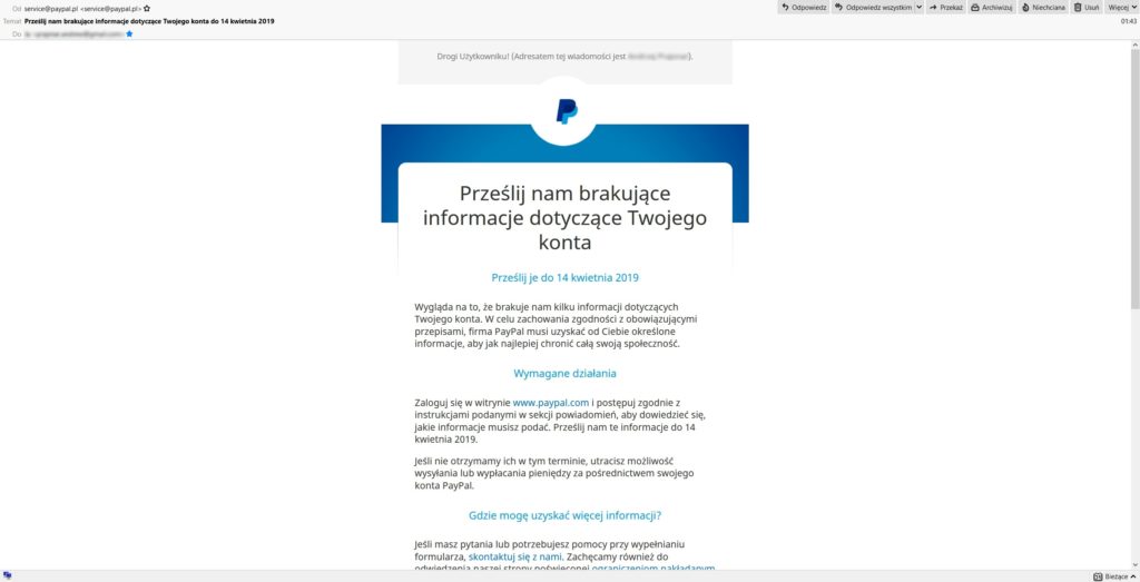 W dalszej kolejności, zajmiemy się uzupełnieniem informacji potrzebnych w ramach usługi PayPal. O konieczności wykonania takiej czynności, przypomni nam odpowiednia wiadomość e-mail (zobacz poniższa grafika). Warto nadmienić, że klient ma dwa tygodnie na uzupełnienie brakujących informacji (np. nie podanej wcześniej daty urodzenia). Po przekroczeniu wspomnianego terminu, nastąpi tymczasowa blokada konta PayPal skutkująca brakiem możliwości wykonywania płatności. O właśnie takiej sankcji będą nas informować regularnie wysyłane wiadomości e-mail.