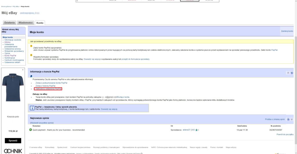 W związku z powyższym, informacje potrzebne serwisowi PayPal (np. datę urodzenia) trzeba uzupełnić możliwie szybko. Aby to zrobić, wystarczy zalogować się do eBaya i kliknąć na zakładkę „Konto”. Teraz będzie tam widoczne okienko z napisem „Informacje o koncie PayPal i trzema opcjami (podgląd podsumowania konta PayPal, podgląd historii konta PayPal i aktualizacja ustawień konta PayPal). Wybieramy trzecią ze wspominanych opcji poprzez kliknięcie na odpowiedni napis (zobacz poniższa grafika).
