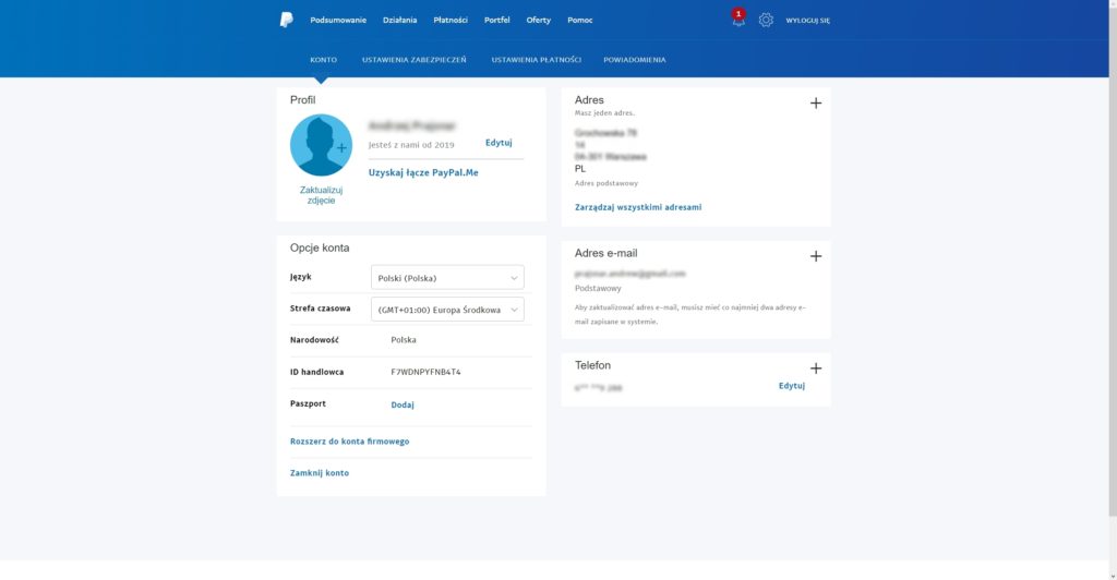Przed aktualizacją/uzupełnieniem informacji wykorzystywanych przez PayPal, konieczne będzie wpisanie swojego e-maila oraz hasła. Mowa o informacjach wcześniej podawanych podczas rejestracji. Po każdym zalogowaniu do systemu PayPal, ujrzymy jego panel główny (patrz poniższa grafika). W tym miejscu zobaczymy m.in. nasze zdjęcie (o ile wcześniej zostało dodane) i podstawowe informacje rejestracyjne. Powiadomienia dotyczące np. konieczności dodania informacji na swój temat są widoczne przy ikonie z dzwonkiem. Warto również zwrócić uwagę na przyciski umożliwiające zamknięcie konta PayPal lub rozszerzenie go do konta firmowego. Ważna jest też opcja pozwalająca na uzyskanie łącza PayPal.Me. Dzięki takiemu imiennemu profilowi na PayPalu, inne osoby będą mogły nam szybko przesyłać pieniądze (np. przy pomocy aplikacji mobilnej).