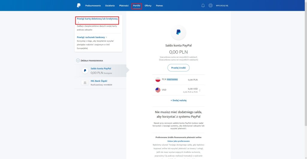 ZWRÓĆ UWAGĘ: W zakładce „Portfel” (patrz poniżej) można również dodawać i konfigurować swoje waluty rozliczeniowe (jedna zawsze jest podstawowa – domyślnie PLN). Sposobem na uniknięcie przewalutowań jest „podpięcie” do PayPala karty w odpowiedniej walucie (USD, GBP lub EUR).