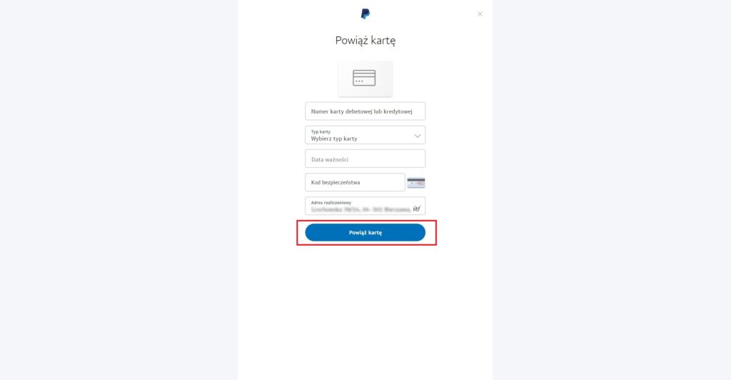 Widoczne poniżej okno służy do powiązywania karty kredytowej lub debetowej z serwisem PayPal. Oprócz numer karty oraz jej rodzaju, trzeba podać datę ważności naszego „plastiku” i trzycyfrowy kod bezpieczeństwa (CVV2, CVC2) widoczny na odwrocie. Na uwagę zasługuje także adres rozliczeniowy, który PayPal uzupełnia przy pomocy wcześniej podanych informacji. Po wypełnieniu krótkiego formularza widocznego na poniższej grafice, trzeba kliknąć przycisk „Powiąż kartę”.