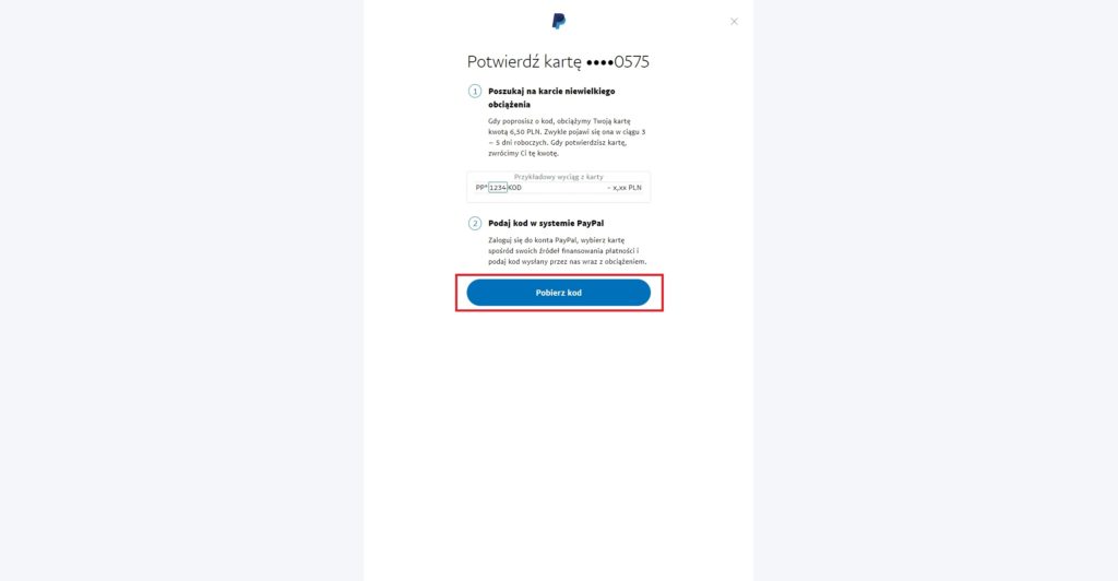 Warto wiedzieć, że PayPal wymaga potwierdzenia karty w celu usunięcia limitów wysokości wypłat i przelewów. Takie potwierdzenie działa bardzo prosto (zobacz poniższa grafika). Po kliknięciu przycisku „Pobierz kod”, PayPal obciąży kartę niewielką kwotą (np. 6,50 zł). W ramach weryfikacji, trzeba będzie podać PayPalowi kod widoczny na wyciągu z karty. Po podaniu przez klienta numeru tej weryfikacyjnej transakcji, operator płatniczy zwróci całą pobrana wcześniej kwotę.