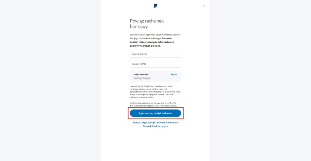 Poniższa grafika pokazuje, jak wygląda okno służące do powiązywania rachunku bankowego z kontem PayPal. Po podaniu informacji na temat konta (nazwa banku i numer w formacie IBAN), klikamy na przycisk „Zgadzam się, powiąż rachunek”. W dalszej kolejności, PayPal wyśle na dodane konto dwie niewielkie wpłaty o losowej wartości. W ramach weryfikacji konta bankowego, później trzeba będzie podać dokładne wartości tych dwóch wpłat. Warto wiedzieć, że dla kont prowadzonych przez bank z USA obowiązuje inna procedura weryfikacyjna (zobacz poniższa grafika).