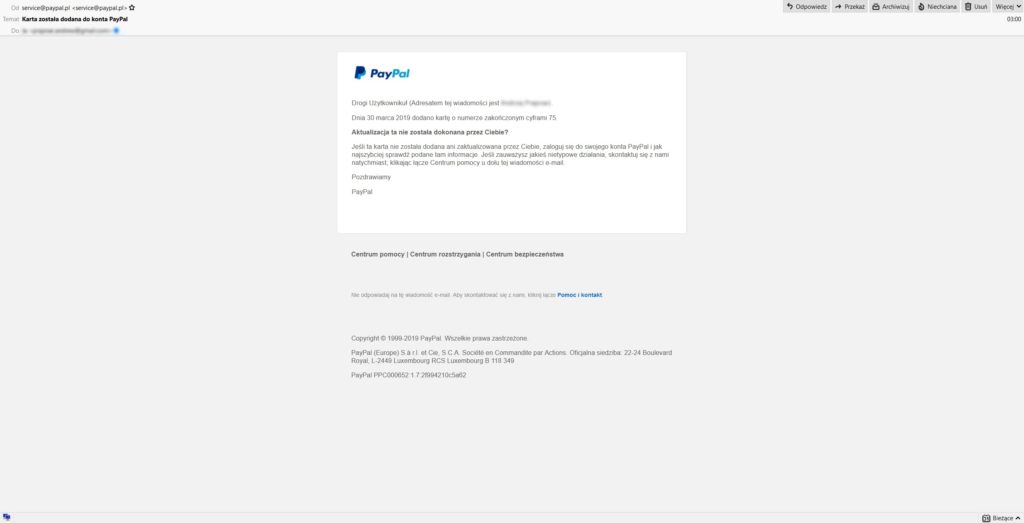 Jeżeli chodzi o dodawanie kont i kart debetowych do PayPala, to warto nadmienić, że powodzenie każdej z takich czynności zostaje podsumowane przy pomocy odpowiedniego e-maila. Poniżej prezentujemy przykładową wiadomość o dodaniu karty debetowej. Znajduje się w niej imię oraz nazwisko klienta PayPal.