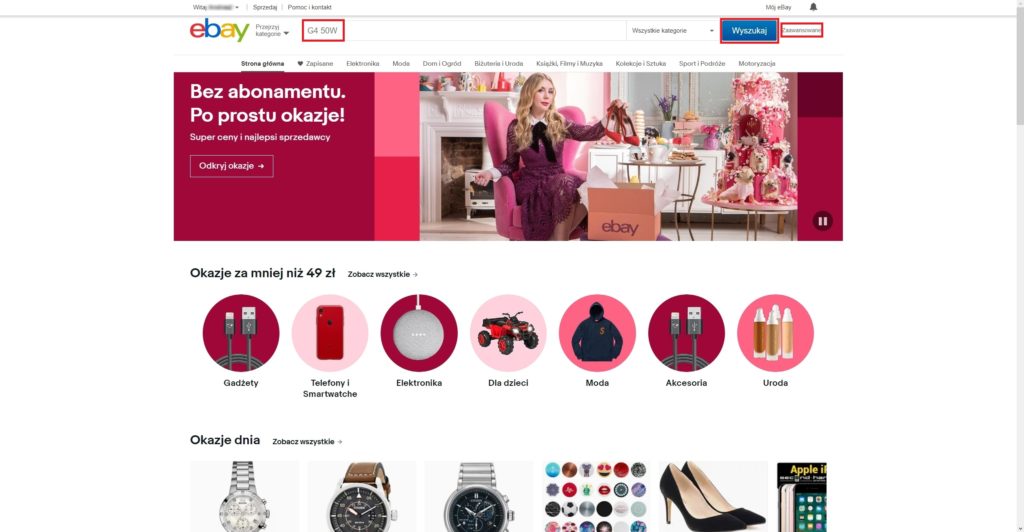 Po właściwym skonfigurowaniu serwisów eBay oraz PayPal, można wreszcie przystąpić do wyszukiwania ciekawych przedmiotów i pierwszych zakupów. Mechanizm wyszukiwania na eBay.pl jest podobny do rozwiązań znanych nam z Allegro. W górnej części strony głównej eBay.pl znajduje się pasek wyszukiwania oraz przycisk „Wyszukaj” (zobacz poniższa grafika). Do tego paska wpisujemy nazwę przedmiotu wyrażoną w języku angielskim. Jest to konieczne nawet w przypadku korzystania z polskiej wersji językowej eBay (eBay.pl). W analizowanym przykładzie, będziemy szukać dość nietypowej żarówki halogenowej do projektorów i mikroskopów (50 wat i trzonek G4), którą bardzo trudno jest kupić w Polsce. Po wpisaniu np. „G4 50W”, do wyboru mamy opcję zwykłego wyszukiwania oraz wyszukiwania zaawansowanego. Ta druga opcja jest dostępna po kliknięciu przycisku „Zaawansowane” (zobacz poniżej).