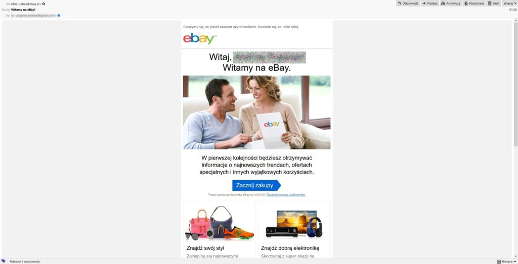 Warto nadmienić, że eBay.pl w odróżnieniu od wielu podobnych serwisów aukcyjnych nie wymaga od nowego klienta potwierdzenia podanego adresu e-mail. Po zakończeniu pierwszego etapu rejestracji, możemy się jednak spodziewać otrzymania powitalnej wiadomości. Będzie w niej umieszczone nasze imię oraz nazwisko. W ten sposób, eBay.pl walczy z oszustami, którzy czasem się pod niego podszywają.
