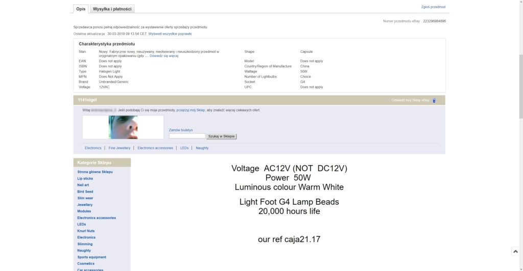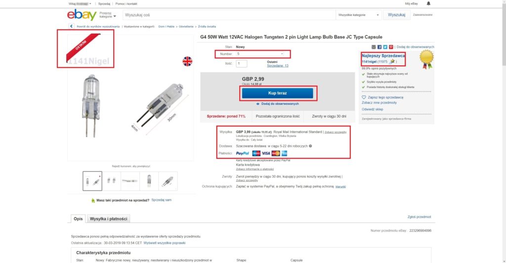 W ramce z napisem „Opis” zobaczymy natomiast dokładniejsze informacje na temat przedmiotu (dotyczące np. miejsca jego produkcji oraz stanu). Na drugiej poniższej grafice widać, że przykładowe żarówki będą kupowane od sklepu. Każdy sklep na eBay może korzystać z gotowego szablonu, w którym znajdują się np. odnośniki do innych jego aukcji.