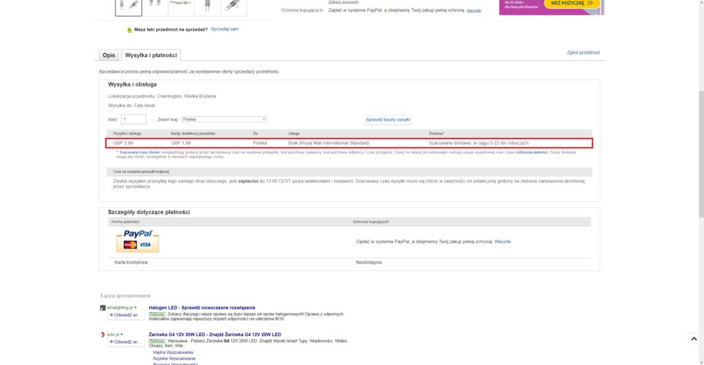 Po wyborze interesującego nas przedmiotu z listy wyszukiwania, przechodzimy do strony jego aukcji (patrz poniżej). Ta strona w dużej mierze przypomina rozwiązania znane z rodzimego Allegro. Można bowiem przypuszczać, że twórcy polskiego serwisu wzorowali się na starszym eBayu. Istnieje jednak kilka ciekawych różnic. Warto na przykład zwrócić uwagę, że po wyborze większej liczby kupowanych żarówek, na ich zdjęciu wyświetla się powiadomienie z napisem „Ostatni”. Zaletą eBay.pl jest to, że informacje o wysyłce oraz jej koszcie są umieszczone w łatwo widocznym miejscu (zaraz pod przyciskami „Licytuj/Kup teraz”). W tym samym miejscu, znajdziemy informacje na temat akceptowanych form płatności i czasu dostawy. Jeżeli chodzi o przykładowe żarówki, to będą one wysyłane z Wielkiej Brytanii przy pomocy najtańszego listu bez opcji monitoringu. Właśnie dlatego szacunkowy czas dostawy jest dość długi (5 dni – 22 dni).
