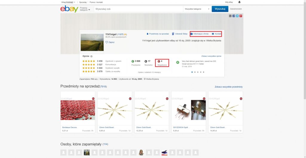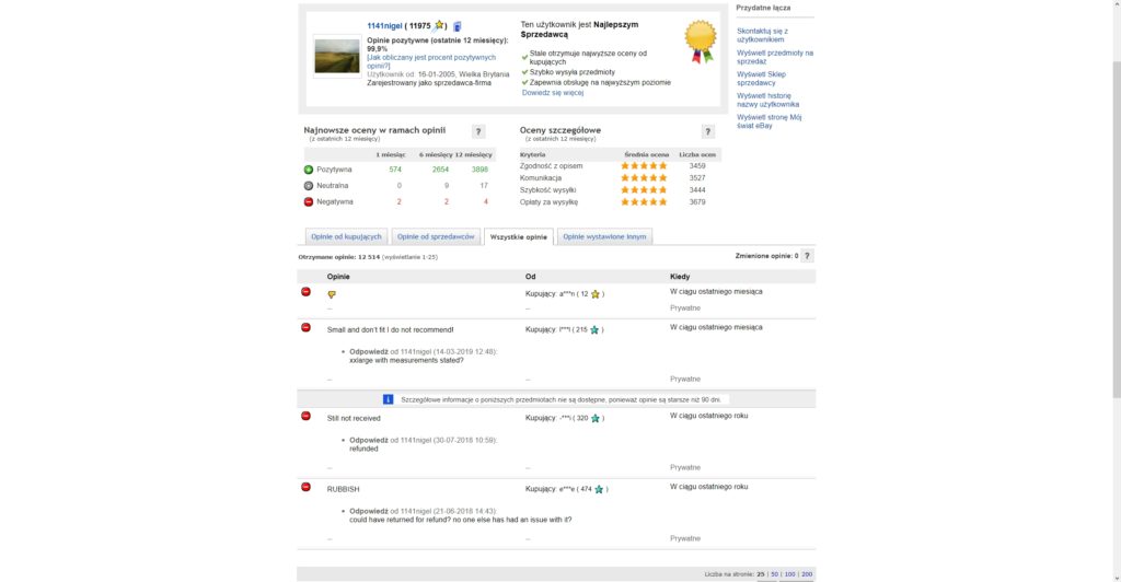 Przed zakupem jakiegoś przedmiotu, warto również sprawdzić stronę jego sprzedawcy (patrz poniżej). Jest ona dostępna po kliknięciu na nazwę sprzedającego. Na tej stronie oprócz listy komentarzy, znajdziemy m.in. dane o dacie założenia konta przez sprzedawcę i ocenie różnych aspektów oferty (np. zgodności przedmiotów z opisem oraz szybkości wysyłki). Po kliknięciu na przyciski „Informacje o firmie” oraz „Kontakt”, można odpowiednio sprawdzić dane sprzedającego oraz wysłać do niego wiadomość. Przykładowy sprzedawca został wyróżniony tytułem „Najlepszego Sprzedawcy” i posiada 99,9% pozytywnych komentarzy. Po kliknięciu na liczbę opinii negatywnych (zobacz poniższe grafiki), można sprawdzić czego dokładnie one dotyczyły. Wynik na poziomie 97% – 99% pozytywnych opinii nie powinien wzbudzać zastrzeżeń lub obaw. Warto pamiętać, że sprzedawcy z gorszymi ocenami często są zupełnie blokowani przez eBay.com (ze względu na spory transakcyjne).