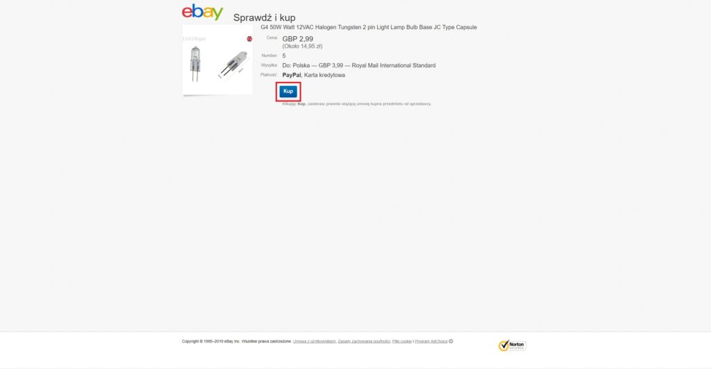 Po podjęciu decyzji o zakupie, trzeba kliknąć przycisk „Kup teraz” lub zalicytować. W przypadku przedmiotów o małej wartości, typowym rozwiązaniem są aukcje tylko z opcją „Kup teraz”. Właśnie taka sytuacja dotyczy przykładowych żarówek. Kupimy ich pięć, aby koszty wysyłki nie były znacząco wyższe od wartości samego towaru. Po kliknięciu na przycisk „Kup teraz”, naszym oczom ukaże się okno podobne do poniższego. Po sprawdzeniu wartości towaru, jego ilości oraz kosztów wysyłki, trzeba nacisnąć przycisk „Kup”.