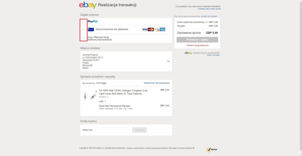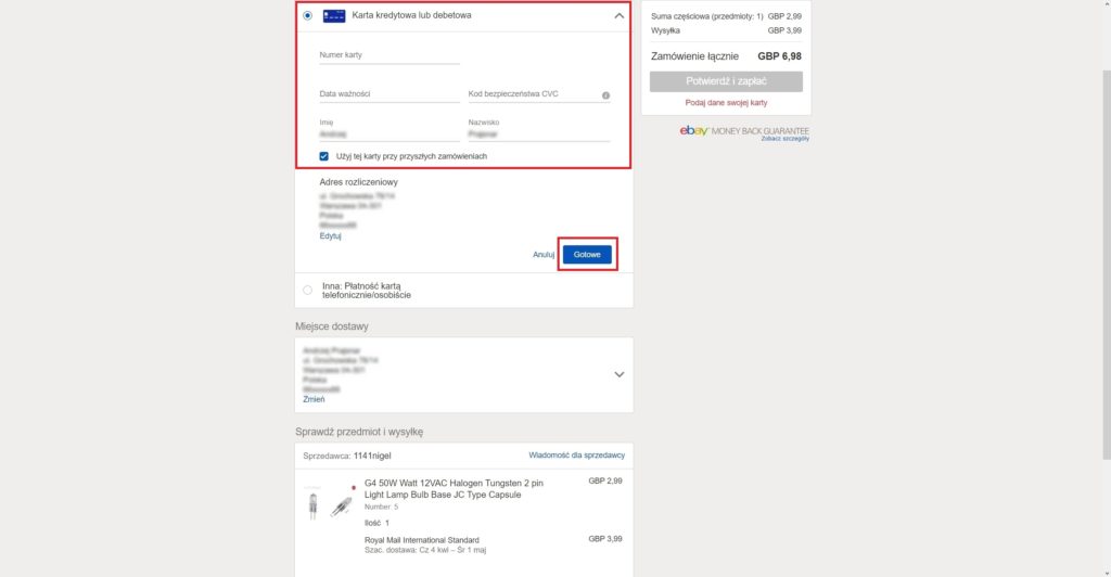 ZWRÓĆ UWAGĘ: Niektórzy sprzedawcy mogą akceptować tylko płatności przez PayPal. W analizowanym przykładzie, oprócz PayPala dostępna jest tylko płatność kartą kredytową/debetową (patrz trzecia poniższa grafika).