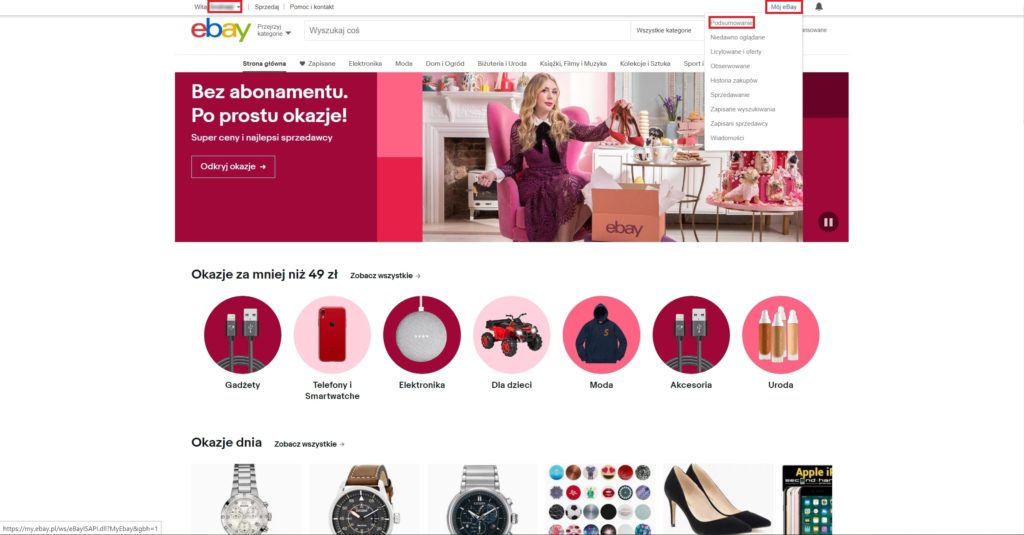 Zaraz po podaniu niezbędnych danych (imienia, nazwiska, adresu e-mail oraz hasła), zostaniemy automatycznie zalogowani do serwisu eBay.pl (patrz poniższa grafika). O udanym logowaniu świadczy imię użytkownika widoczne w lewym górnym rogu ekranu (tam gdzie wcześniej znajdowały się przyciski logowania oraz rejestracji). Zaraz po pierwszym zalogowaniu, warto przejść do głównego panelu eBay (odpowiednika „Moje Allegro”). W tym celu, klikamy na napis „Mój eBay” widoczny po prawej górnej stronie ekranu i wybieramy opcję „Podsumowanie”.