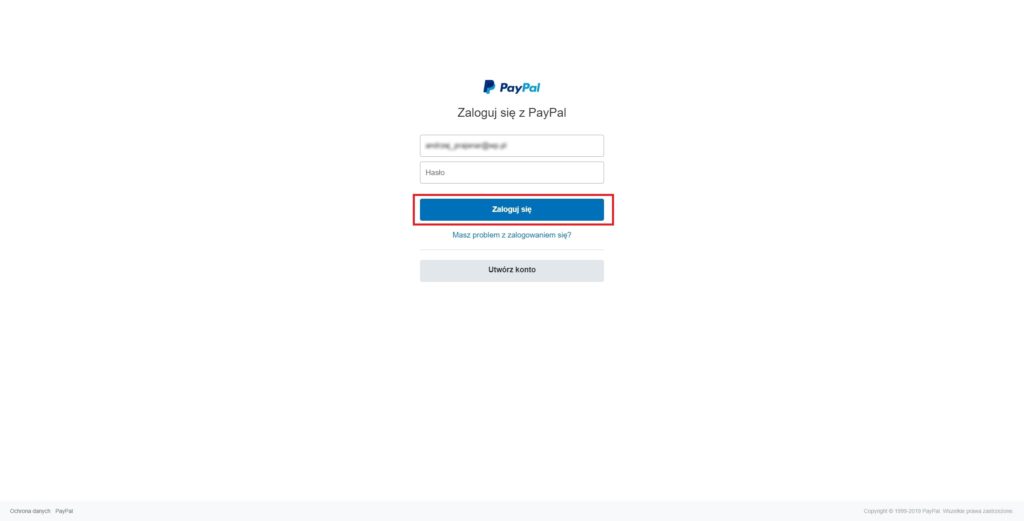 Następnym wymaganym krokiem jest zalogowanie się do PayPala (patrz poniższa grafika). Na tym etapie możliwe będzie również utworzenie nowego konta PayPal.