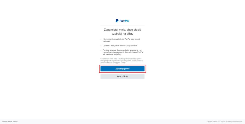 Po zalogowaniu, PayPal zapyta, czy chcemy być pamiętani na tym komputerze lub innym urządzeniu połączonym do Internetu. Takiej opcji nie można wybierać, jeżeli aktualnie korzystamy z urządzenia innego niż prywatne. W takiej sytuacji, trzeba kliknąć na przycisk z napisem „Może później” (zamiast „Zapamiętaj mnie”).