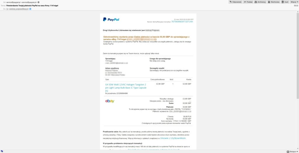 O warunkach płatności i zakupu, powiadomi nas też e-mail, który serwis eBay wysłał na naszą skrzynkę. W tym komunikacie jak zwykle znajdziemy nasze dane osobowe (imię oraz nazwisko). Taka sama zasada dotyczy wiadomości o realizacji transakcji, którą osobno wysyła PayPal (patrz druga poniższa grafika).