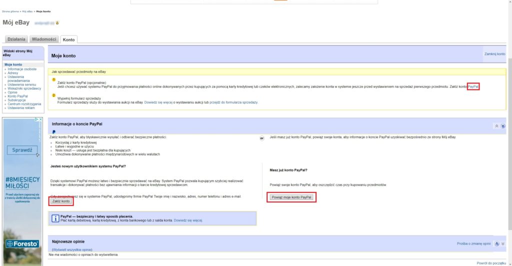ZWRÓĆ UWAGĘ: Jeżeli już wcześniej założyliśmy konto PayPal (np. w celu wysyłania pieniędzy znajomym lub płacenia na innych serwisach), to po rejestracji na eBay nie trzeba jeszcze raz rejestrować się na PayPalu. Istnieje bowiem możliwość powiązania profilu z PayPala oraz nowo założonego konta eBay.pl.