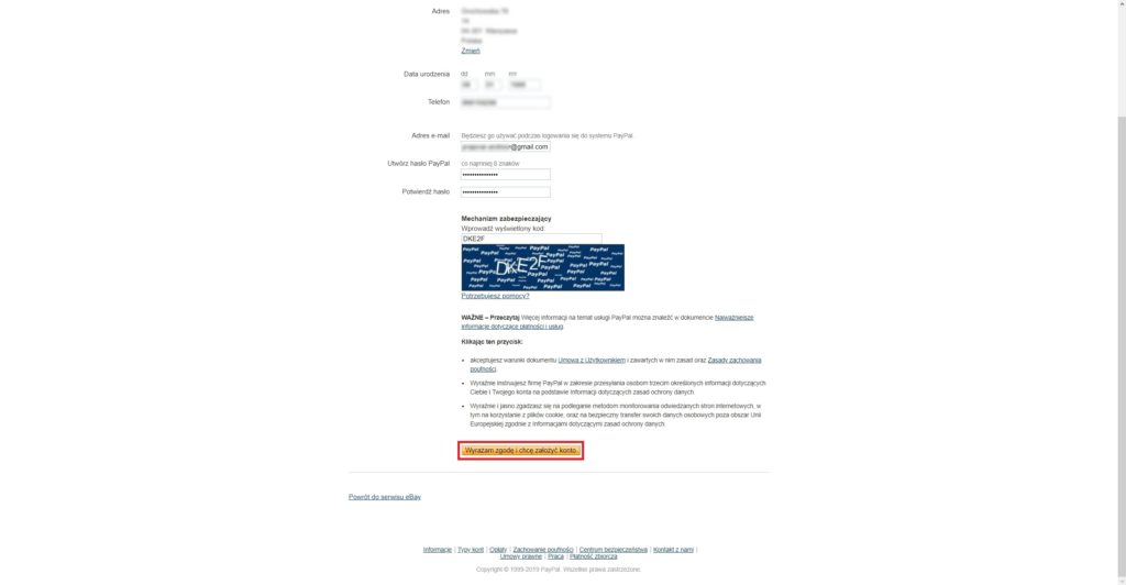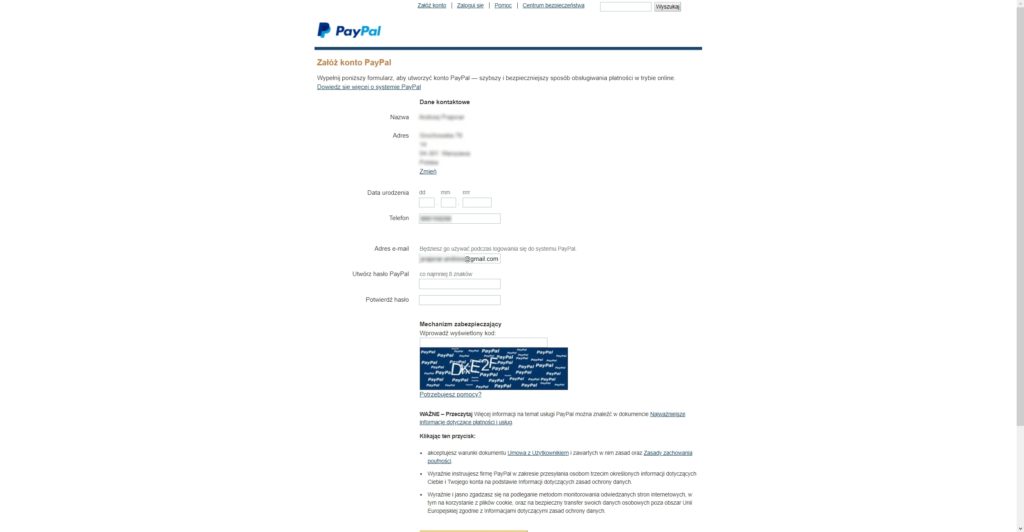 W ramach kolejnego kroku, zostaniemy już przeniesieni na stroną PayPala. Naszym oczom ukaże się dość długi formularz rejestracyjny. Można w nim edytować wcześniej podany adres oraz numer telefonu. PayPal wymaga też podania daty urodzenia i hasła do serwisu (zobacz poniższa grafika). Dodatkowo trzeba przepisać kod weryfikacyjny. W dalszej kolejności, należy kliknąć przycisk widoczny na dole ekranu (patrz kolejna grafika). Warto nadmienić, że naciśnięcie przycisku z napisem „Wyrażam zgodę i chcę założyć konto” oznacza automatyczną akceptację wszystkich zasad działania serwisu PayPal.