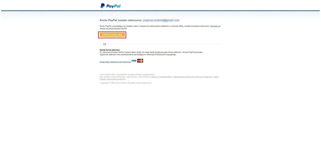 W ramach kolejnego okna, PayPal poinformuje nas o tym, że konto klienta zostało utworzone. Osoba kończąca rejestrację, będzie na tym etapie miała do wyboru dwie opcje. Pierwsza z nich polega na dodaniu karty płatniczej do konta PayPal. W ramach drugiej opcji, można natomiast wrócić na serwis eBay. Wybierzemy tę drugą opcję, aby najpierw uzupełnić dane adresowe. Dopiero później zajmiemy się dodawaniem karty debetowej. Dzięki temu będzie można pokazać sposób na łatwe przeniesienie się z eBay.pl na PayPala.