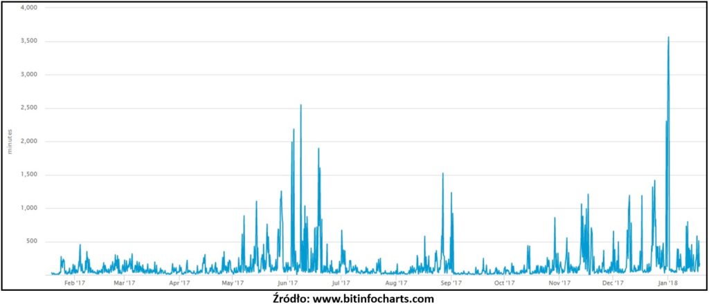 Dane serwisu bitcoinfees.earn.com z 19 stycznia 2018 r. wskazują, że osoba zainteresowana wykonaniem darmowego przelewu, musiała wówczas czekać przynajmniej 540 minut na zatwierdzenie tej operacji. Można oczekiwać, że czas realizacji większości darmowych zleceń płatniczych był kilkakrotnie dłuższy. Taki czas oczekiwania na realizację przelewu w BTC, może się znacząco wydłużyć, gdy sieć Bitcoin przeżywa poważne problemy na wskutek obciążenia. Wzrosty przeciętnego czasu potwierdzenia przelewu, które są widoczne na poniższym wykresie, bardzo dobrze nam pokazują, kiedy miały miejsce ostatnie problemy z obciążeniem sieci Bitcoin. Dane serwisu blockchain.info wskazują, że szczególnie pechowa była noc z 31 grudnia 2017 r. na 1 stycznia 2018 r. Wtedy przeciętny czas potwierdzenia przelewu znacząco przekroczył 3000 minut. Warto pamiętać, że ten wynik uwzględnia również płatne przelewy. Już wcześniej (to znaczy przed 31 grudnia 2017 r.) zdarzały się sytuacje, w których przeciętny czas realizacji bitcoinowego przelewu przekraczał 1000 minut (patrz poniższy wykres).